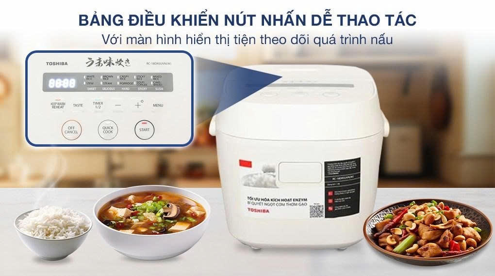 Nồi cơm điện tử Toshiba RC-18DR5UVN được trang bị hệ thống điều khiển nút nhấn điện tử và màn hình hiển thị LED. Các chức năng được thể hiện rõ ràng, dễ đọc, dễ thao tác. Cùng với màn hình LED hiển thị sáng rõ thời gian nấu, giúp bạn dễ dàng theo dõi quá trình nấu nướng.