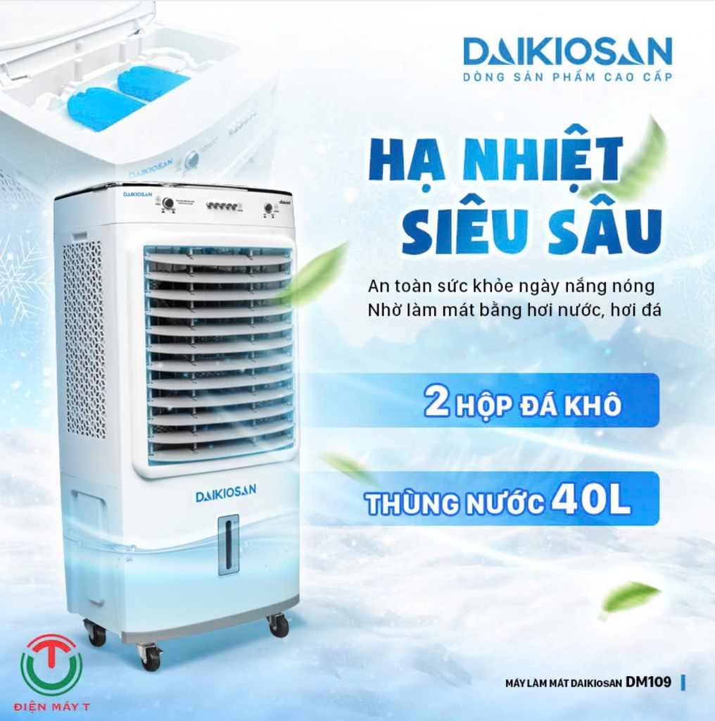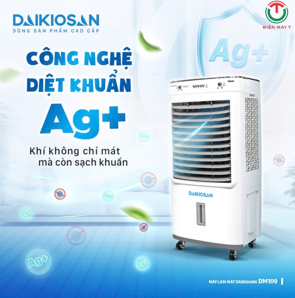 Quạt điều hòa Daikiosan DM109 mới là thiết bị máy làm mát được tích hợp công nghệ Ag+ siêu mát, lọc bụi, khử mùi hôi bên trong thùng chứa, hỗ trợ diệt khuẩn tối ưu. Có thể nói đây là thiết bị trong bộ sưu tập sản phẩm mới tích hợp công nghệ Ag+ đầu tiên trên thị trường của Daikiosan.