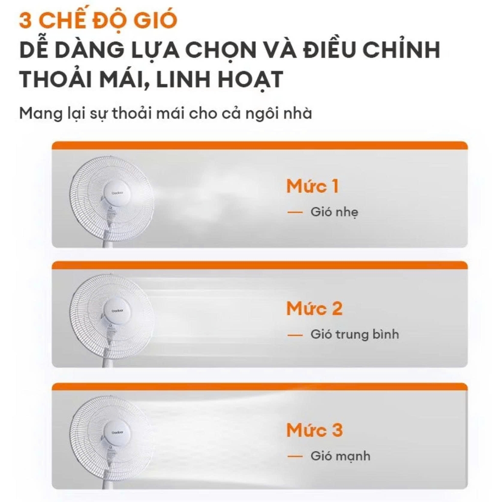 Quạt Gaabor FM430M-WH05A được trang bị 3 cấp độ gió linh hoạt từ nhẹ đến mạnh, đáp ứng nhu cầu sử dụng đa dạng của người dùng ở nhiều lứa tuổi: