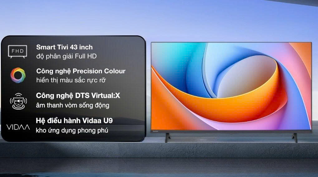 - Thiết kế tối giản, hiện đại với màn hình 43 inch, thích hợp cho không gian phòng nhỏ và vừa.