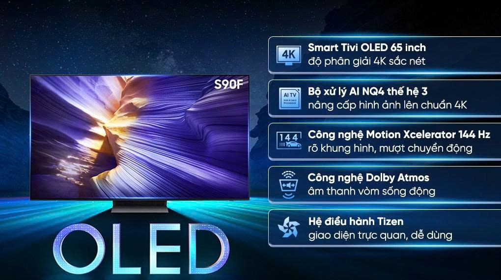 Smart Tivi Samsung OLED 4K Vision AI 65 Inch QA65S90F là sự lựa chọn lý tưởng dành cho những ai mong muốn sở hữu một chiếc TV OLED cao cấp, kết hợp giữa hình ảnh 4K sắc nét, âm thanh sống động đa chiều và hàng loạt tính năng thông minh hiện đại, đáp ứng trọn vẹn nhu cầu giải trí đỉnh cao.