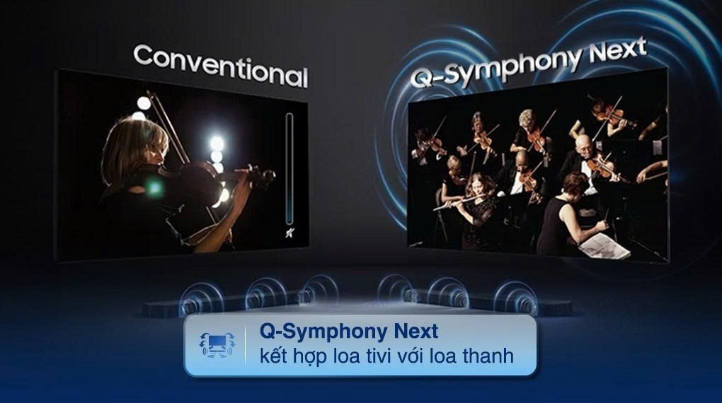 Nếu không có Q-Symphony, âm thanh sẽ chỉ trình phát qua loa, tuy nhiên, nếu như bạn khởi động công nghệ này, các giai điệu sẽ phát ra đồng thời từ cả hai thiết bị. Điều này giúp chất âm thêm mạnh mẽ, sôi động hơn để phục vụ hiệu quả cho những bữa tiệc tại gia của người dùng.