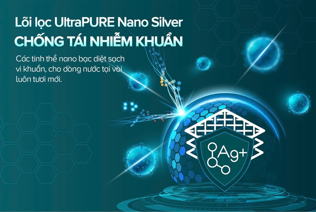 Lõi lọc UltraPURE Nano Silver với cấu trúc than hoạt tính gáo dừa được phủ bạc nano giúp ngăn chặn nước bị nhiễm khuẩn trở lại bằng các tinh thể bạc. Các ion bạc có khả năng khử khuẩn vượt trội, giữ sạch sẽ và an toàn cho nguồn nước, hạn chế bệnh tật gây ra từ nguồn nước uống.