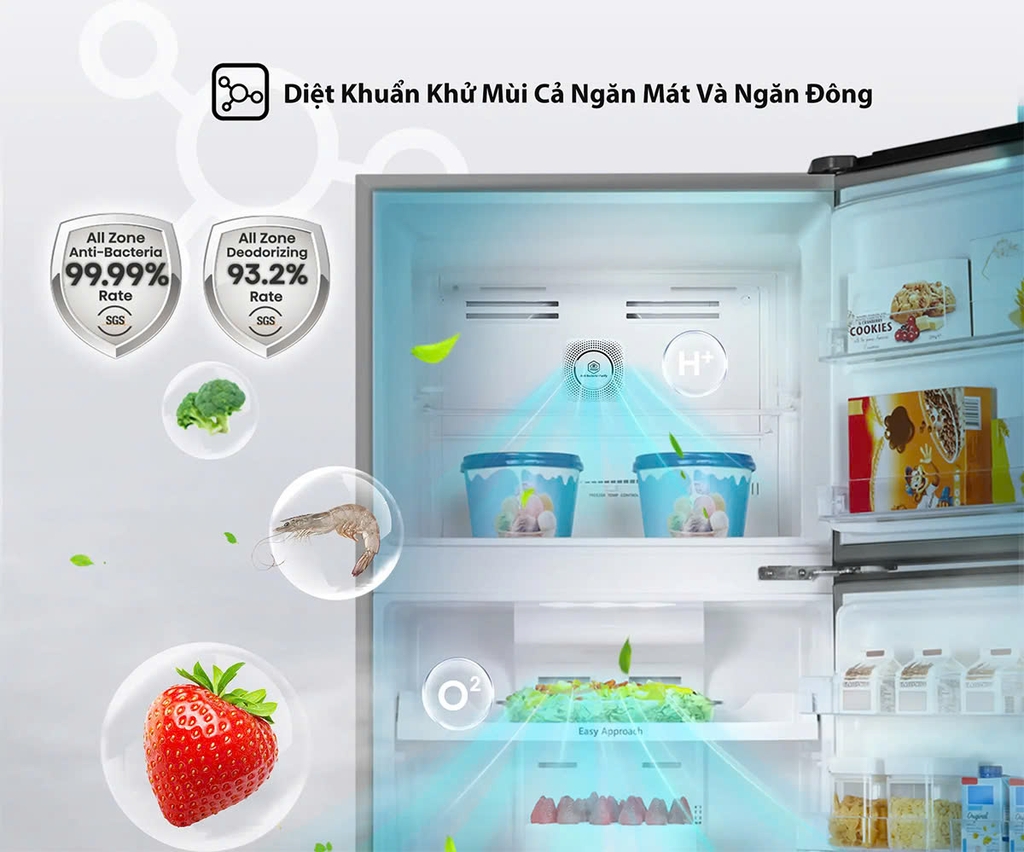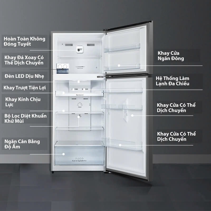 Hệ thống đèn LED được thiết kế để chiếu sáng mọi ngóc ngách bên trong tủ lạnh, giúp bạn dễ dàng nhìn thấy đồ bạn cần. Ánh sáng không chói mắt và dịu nhẹ nhưng vẫn đủ sáng để bạn nhanh chóng tìm thấy thực phẩm.
