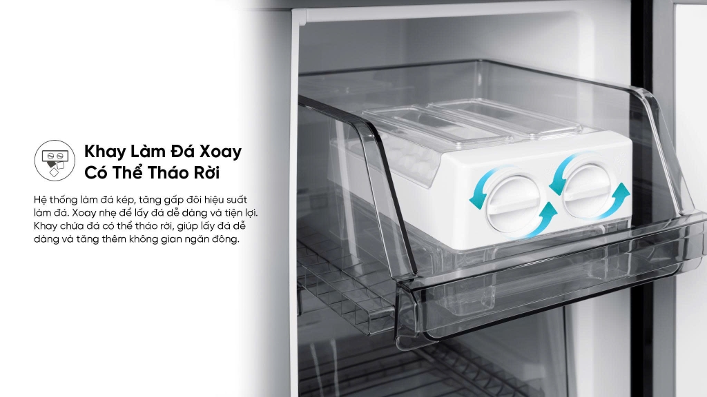 Khay đá xoay: Thiết kế tiện dụng, dễ dàng lấy đá khi cần mà không lo bị dính chặt.