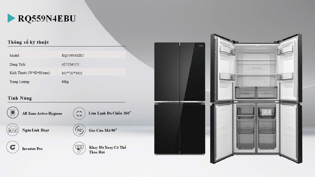 Với thiết kế nhiều cửa sang trọng, dung tích 427 lít rộng rãi, cùng hàng loạt công nghệ hiện đại như Inverter Pro tiết kiệm điện, diệt khuẩn khử mùi 2 ngăn và làm lạnh đa chiều, Tủ Lạnh Hisense Inverter 427 Lít RQ559N4EBU chính là sự lựa chọn tối ưu cho những gia đình đang tìm kiếm một chiếc tủ lạnh vừa hiện đại vừa hiệu quả.