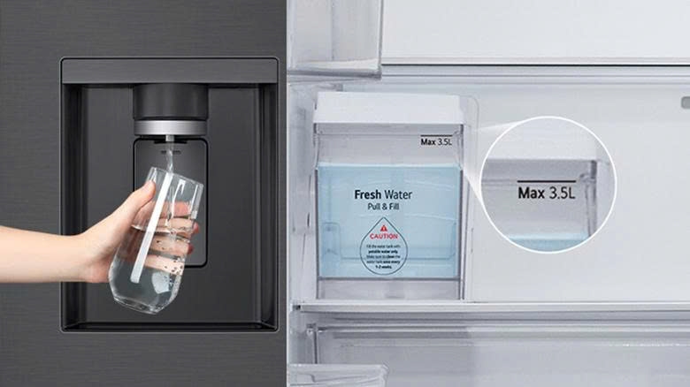 Tủ lạnh LG Inverter 576 lít Multi Door InstaView LFD58BLMAI trang bị ngăn lấy nước ngoài tiện dụng, cung cấp nguồn nước mát lạnh cho gia đình mà không cần mở tủ gây thất thoát nhiệt, hạn chế chạm tay trực tiếp vào bình nước, đảm bảo vệ sinh, an toàn cho sức khỏe. Thiết kế của cửa rót nước và đá có khoảng trống cao giúp dễ dàng lấy nước vào bình chứa lớn, cốc cao.