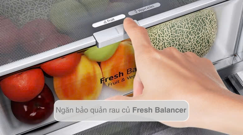 - Ngăn bảo quản rau củ cân bằng ẩm lưới mắt cáo 2 chế độ Fresh Balancer giúp giữ độ ẩm tối ưu, tránh tình trạng trái cây rau củ bị mất nước, từ đó luôn giữ được độ tươi lâu hơn.