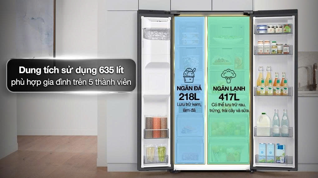 Với dung tích thực lên đến 635L, mẫu tủ lạnh Samsung side by side này là lựa chọn thích hợp với nhu cầu sử dụng của những gia đình đông người (từ 5 thành viên trở lên). Ngoài ra, những gia đình tuy có ít người hơn nhưng cần lưu trữ nhiều thực phẩm để sử dụng cho cả tuần chẳng hạn thì cũng có thể chọn chiếc tủ lạnh Samsung 635L này.