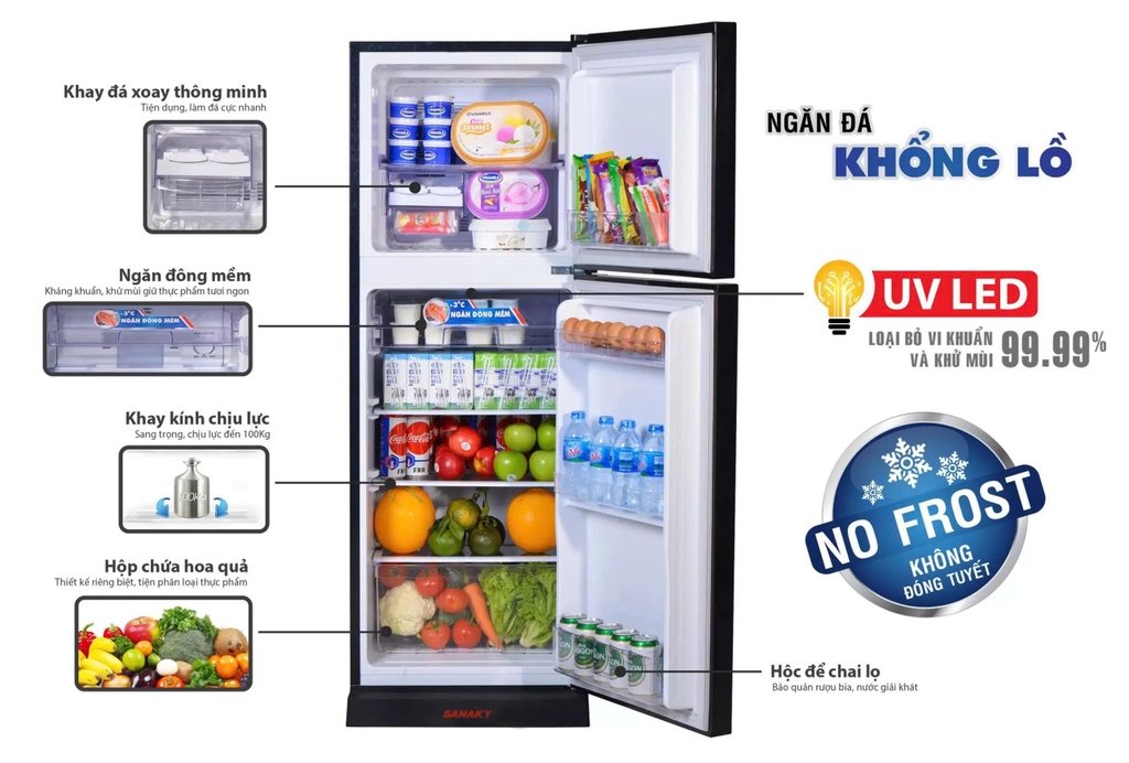 Cùng với ngăn đông mềm tủ lạnh Sanaky giúp giữ cho thực phẩm luôn tươi ngon, trọn dưỡng chất, hoàn toàn không đông đá ở nhiệt độ đông mềm lý tưởng chuẩn -3°C .