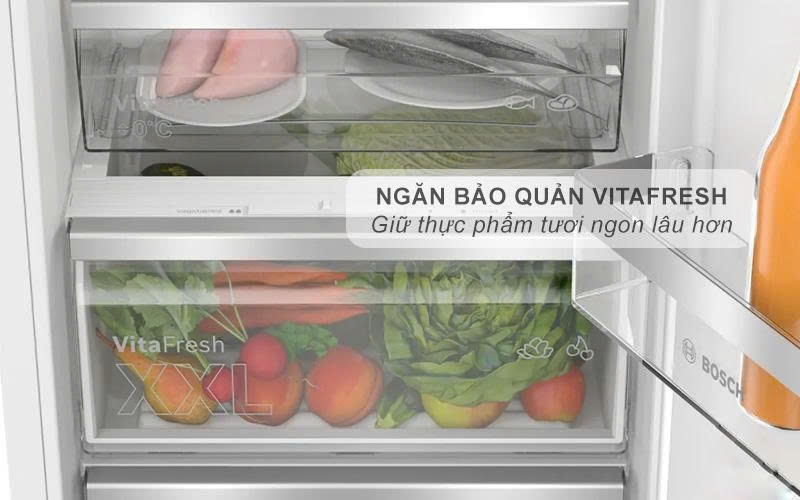 Tủ mát được trang bị công nghệ VitaFresh XXL <0°C>, duy trì mức nhiệt gần 0°C – môi trường lý tưởng để bảo quản thịt, cá và rau củ quả. Hệ thống ngăn kéo điều chỉnh độ ẩm giúp trái cây và rau củ giữ được độ tươi lâu hơn, giòn ngon hơn mà không bị héo úa như các ngăn mát thông thường.